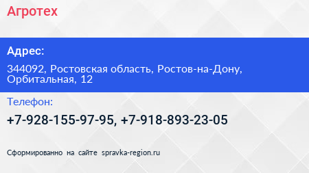 Агротех по адресу 344092, Ростовская область, Ростов-на-Дону, Орбитальная, 12 в дальнейшем Организация, размещена в следующих категориях: