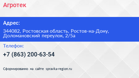 Агротек по адресу 344082, Ростовская область, Ростов-на-Дону, Доломановский переулок, 2/5а в дальнейшем Организация, размещена в следующих категориях: