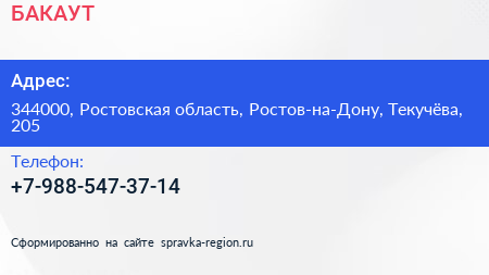 БАКАУТ по адресу 344000, Ростовская область, Ростов-на-Дону, Текучёва, 205 в дальнейшем Организация, размещена в следующих категориях: