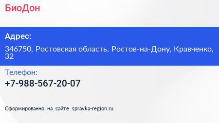 БиоДон по адресу 346750, Ростовская область, Ростов-на-Дону, Кравченко, 32 в дальнейшем Организация, размещена в следующих категориях: