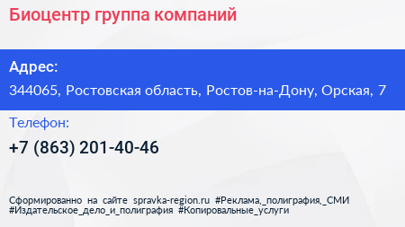 Биоцентр, группа компаний по адресу 344065, Ростовская область, Ростов-на-Дону, Орская, 7 в дальнейшем Организация, размещена в следующих категориях: