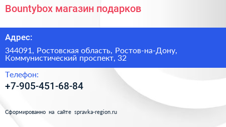 Bountybox, магазин подарков по адресу 344091, Ростовская область, Ростов-на-Дону, Коммунистический проспект, 32 в дальнейшем Организация, размещена в следующих категориях: