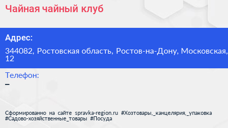 Чайная, чайный клуб по адресу 344082, Ростовская область, Ростов-на-Дону, Московская, 12 в дальнейшем Организация, размещена в следующих категориях: