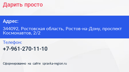 Дарить просто! по адресу 344092, Ростовская область, Ростов-на-Дону, проспект Космонавтов, 2/2 в дальнейшем Организация, размещена в следующих категориях: