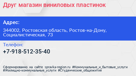 Друг, магазин виниловых пластинок по адресу 344002, Ростовская область, Ростов-на-Дону, Социалистическая, 73 в дальнейшем Организация, размещена в следующих категориях: