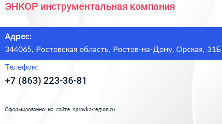ЭНКОР, инструментальная компания по адресу 344065, Ростовская область, Ростов-на-Дону, Орская, 31Б в дальнейшем Организация, размещена в следующих категориях: