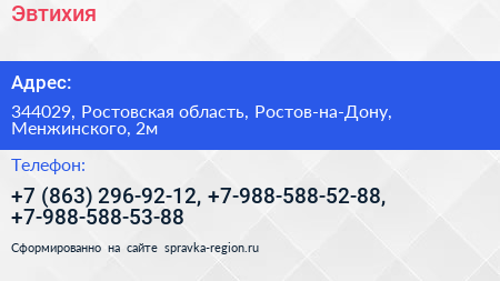 Эвтихия по адресу 344029, Ростовская область, Ростов-на-Дону, Менжинского, 2м в дальнейшем Организация, размещена в следующих категориях: