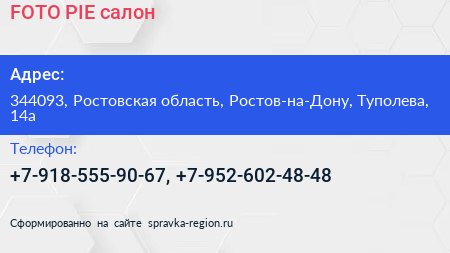 FOTO-PIE, салон по адресу 344093, Ростовская область, Ростов-на-Дону, Туполева, 14а в дальнейшем Организация, размещена в следующих категориях: