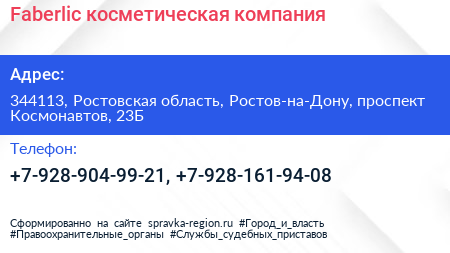 Faberlic, косметическая компания по адресу 344113, Ростовская область, Ростов-на-Дону, проспект Космонавтов, 23Б в дальнейшем Организация, размещена в следующих категориях: