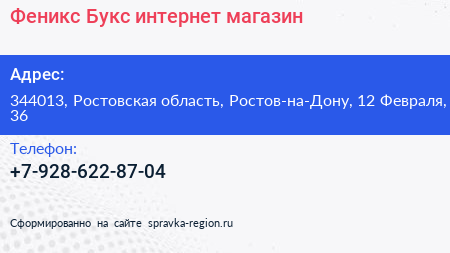 Феникс-Букс, интернет-магазин по адресу 344013, Ростовская область, Ростов-на-Дону, 12 Февраля, 36 в дальнейшем Организация, размещена в следующих категориях: