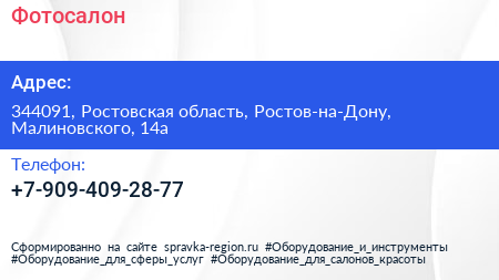 Фотосалон по адресу 344091, Ростовская область, Ростов-на-Дону, Малиновского, 14а в дальнейшем Организация, размещена в следующих категориях: