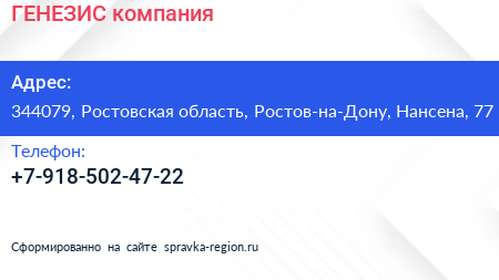 ГЕНЕЗИС, компания по адресу 344079, Ростовская область, Ростов-на-Дону, Нансена, 77 в дальнейшем Организация, размещена в следующих категориях:
