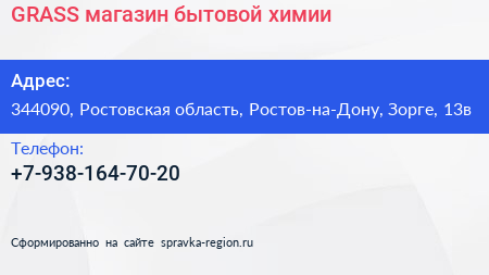 GRASS, магазин бытовой химии по адресу 344090, Ростовская область, Ростов-на-Дону, Зорге, 13в в дальнейшем Организация, размещена в следующих категориях: