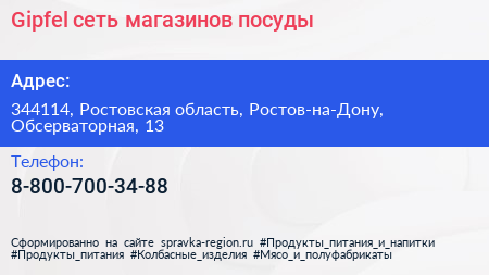 Gipfel, сеть магазинов посуды по адресу 344114, Ростовская область, Ростов-на-Дону, Обсерваторная, 13 в дальнейшем Организация, размещена в следующих категориях: