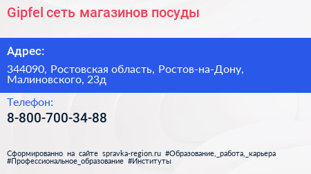 Gipfel, сеть магазинов посуды по адресу 344090, Ростовская область, Ростов-на-Дону, Малиновского, 23д в дальнейшем Организация, размещена в следующих категориях: