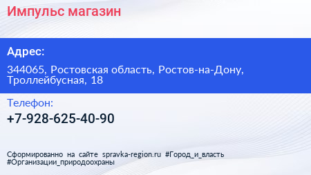Импульс, магазин по адресу 344065, Ростовская область, Ростов-на-Дону, Троллейбусная, 18 в дальнейшем Организация, размещена в следующих категориях: