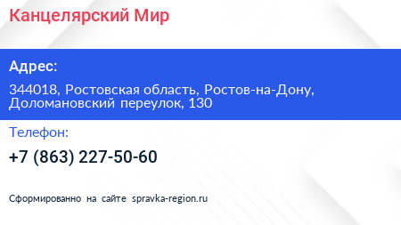 Канцелярский Мир по адресу 344018, Ростовская область, Ростов-на-Дону, Доломановский переулок, 130 в дальнейшем Организация, размещена в следующих категориях: