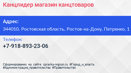 Канцлидер, магазин канцтоваров по адресу 344010, Ростовская область, Ростов-на-Дону, Петренко, 1 в дальнейшем Организация, размещена в следующих категориях:
