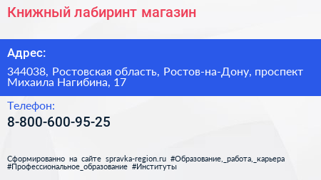 Книжный лабиринт, магазин по адресу 344038, Ростовская область, Ростов-на-Дону, проспект Михаила Нагибина, 17 в дальнейшем Организация, размещена в следующих категориях:
