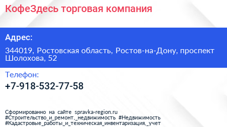 КофеЗдесь, торговая компания по адресу 344019, Ростовская область, Ростов-на-Дону, проспект Шолохова, 52 в дальнейшем Организация, размещена в следующих категориях: