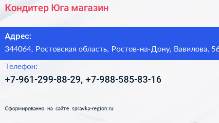 Кондитер Юга, магазин по адресу 344064, Ростовская область, Ростов-на-Дону, Вавилова, 56 в дальнейшем Организация, размещена в следующих категориях: