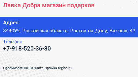 Лавка Добра, магазин подарков по адресу 344095, Ростовская область, Ростов-на-Дону, Вятская, 43 в дальнейшем Организация, размещена в следующих категориях: