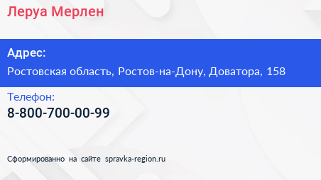 Леруа Мерлен по адресу Ростовская область, Ростов-на-Дону, Доватора, 158 в дальнейшем Организация, размещена в следующих категориях:
