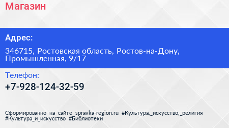 Магазин по адресу 346715, Ростовская область, Ростов-на-Дону, Промышленная, 9/17 в дальнейшем Организация, размещена в следующих категориях: