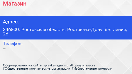 Магазин по адресу 346800, Ростовская область, Ростов-на-Дону, 6-я линия, 26 в дальнейшем Организация, размещена в следующих категориях: