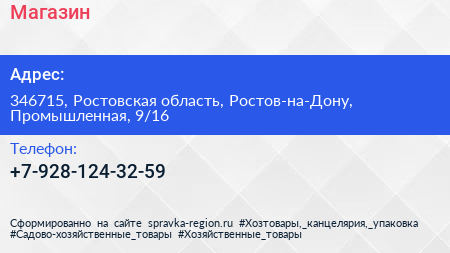 Магазин по адресу 346715, Ростовская область, Ростов-на-Дону, Промышленная, 9/16 в дальнейшем Организация, размещена в следующих категориях: