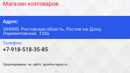 Магазин хозтоваров по адресу 344000, Ростовская область, Ростов-на-Дону, Лермонтовская, 118а в дальнейшем Организация, размещена в следующих категориях:
