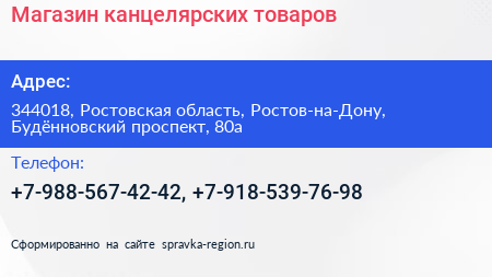 Магазин канцелярских товаров по адресу 344018, Ростовская область, Ростов-на-Дону, Будённовский проспект, 80а в дальнейшем Организация, размещена в следующих категориях: