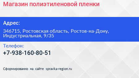 Магазин полиэтиленовой пленки по адресу 346715, Ростовская область, Ростов-на-Дону, Индустриальная, 9/35 в дальнейшем Организация, размещена в следующих категориях: