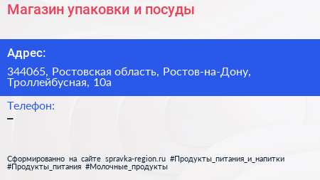Магазин упаковки и посуды по адресу 344065, Ростовская область, Ростов-на-Дону, Троллейбусная, 10а в дальнейшем Организация, размещена в следующих категориях: