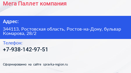 Мега Паллет, компания по адресу 344113, Ростовская область, Ростов-на-Дону, бульвар Комарова, 28/2 в дальнейшем Организация, размещена в следующих категориях: