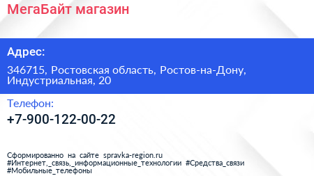 МегаБайт, магазин по адресу 346715, Ростовская область, Ростов-на-Дону, Индустриальная, 20 в дальнейшем Организация, размещена в следующих категориях: