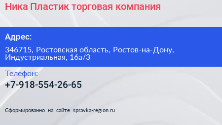 Ника Пластик, торговая компания по адресу 346715, Ростовская область, Ростов-на-Дону, Индустриальная, 16а/3 в дальнейшем Организация, размещена в следующих категориях: