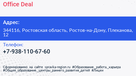 Office Deal по адресу 344116, Ростовская область, Ростов-на-Дону, Плеханова, 12 в дальнейшем Организация, размещена в следующих категориях: