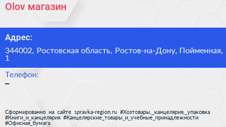 Olov, магазин по адресу 344002, Ростовская область, Ростов-на-Дону, Пойменная, 1 в дальнейшем Организация, размещена в следующих категориях: