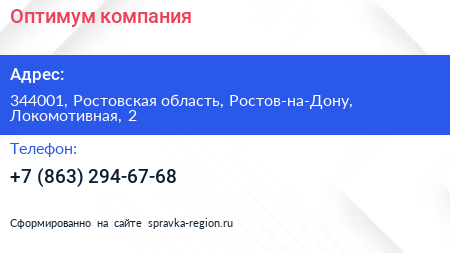 Оптимум, компания по адресу 344001, Ростовская область, Ростов-на-Дону, Локомотивная, 2 в дальнейшем Организация, размещена в следующих категориях: