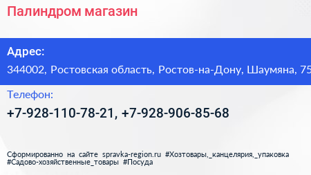 Палиндром, магазин по адресу 344002, Ростовская область, Ростов-на-Дону, Шаумяна, 75 в дальнейшем Организация, размещена в следующих категориях: