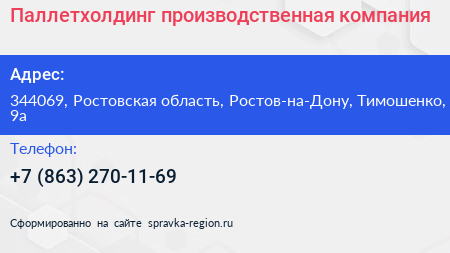 Паллетхолдинг, производственная компания по адресу 344069, Ростовская область, Ростов-на-Дону, Тимошенко, 9а в дальнейшем Организация, размещена в следующих категориях: