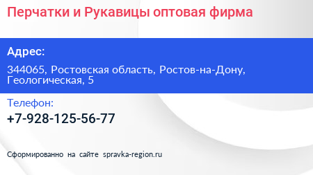 Перчатки и Рукавицы, оптовая фирма по адресу 344065, Ростовская область, Ростов-на-Дону, Геологическая, 5 в дальнейшем Организация, размещена в следующих категориях: