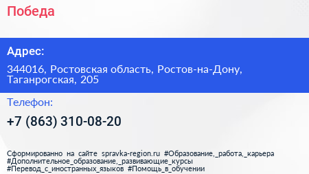 Победа по адресу 344016, Ростовская область, Ростов-на-Дону, Таганрогская, 205 в дальнейшем Организация, размещена в следующих категориях: