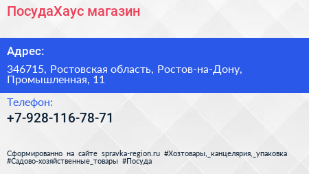 ПосудаХаус, магазин по адресу 346715, Ростовская область, Ростов-на-Дону, Промышленная, 11 в дальнейшем Организация, размещена в следующих категориях:
