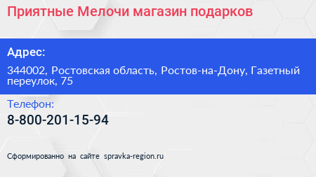 Приятные Мелочи, магазин подарков по адресу 344002, Ростовская область, Ростов-на-Дону, Газетный переулок, 75 в дальнейшем Организация, размещена в следующих категориях:
