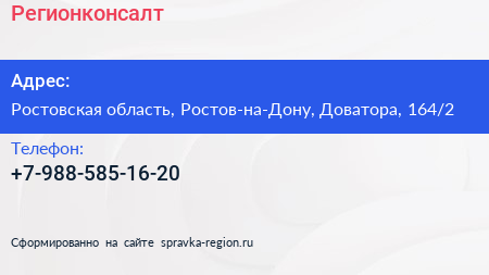 Регионконсалт по адресу Ростовская область, Ростов-на-Дону, Доватора, 164/2 в дальнейшем Организация, размещена в следующих категориях: