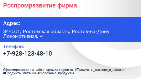 Роспромразвитие, фирма по адресу 344001, Ростовская область, Ростов-на-Дону, Локомотивная, 4 в дальнейшем Организация, размещена в следующих категориях: