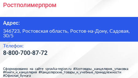 Ростполимерпром по адресу 346723, Ростовская область, Ростов-на-Дону, Садовая, 30/5 в дальнейшем Организация, размещена в следующих категориях: