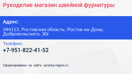 Рукоделие, магазин швейной фурнитуры по адресу 344113, Ростовская область, Ростов-на-Дону, Добровольского, 30г в дальнейшем Организация, размещена в следующих категориях:
